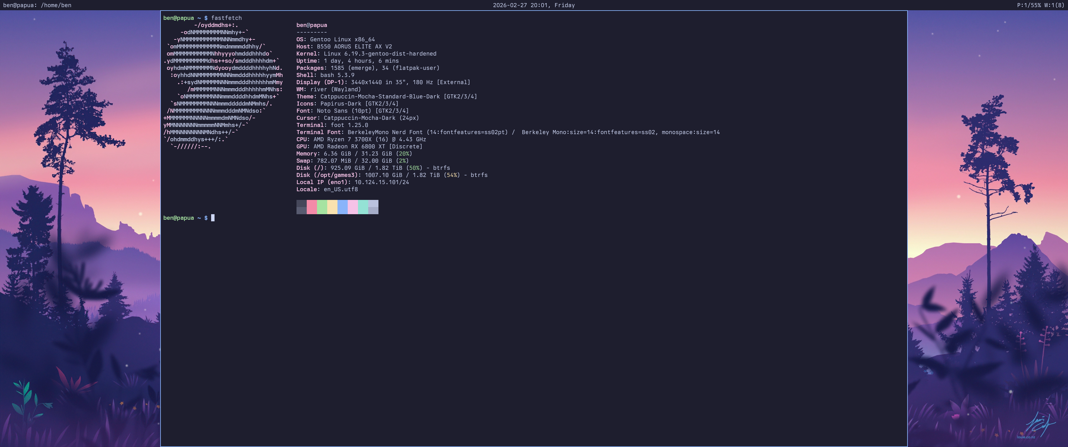 A tiling window manager for the river Wayland compositor written in Zig. The window manager communicates using the river-window-management-v1 protocol, as well as some of River's additional Wayland protocols.